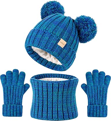 Children Winter Hat Scarf Gloves Set Kids Warm Beanie Fleece Lined Knit PomPom Woollen Hat for Boys and Girls 3-9